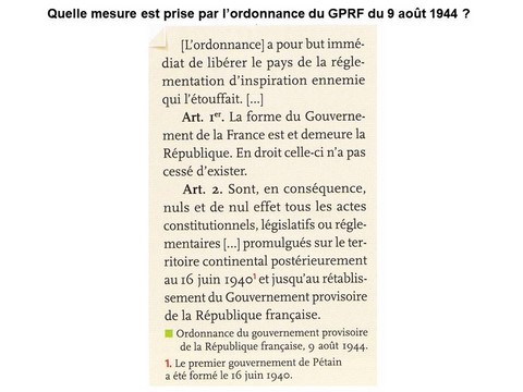L’une des premières mesures du GPRF est de déclarer le régime Vichy comme illégal et d’annuler toutes ses décisions depuis sa création le 16 juin 1940. Ce régime prend définitivement fin le 20 août 1944 avec l’exil du maréchal Pétain pour l’Allemagne. Le GPRF réinstaure alors les principales libertés individuelles et collectives et met en place des tribunaux d’épuration pour juger tous les collaborateurs, et plus particulièrement les responsables du régime de Vichy. Philippe Pétain est ainsi jugé par la Haute Cour de justice entre le 23 juillet et le 15 août 1945. Il est condamné à la dégradation nationale puis à la peine de mort. Toutefois, de Gaulle intervient en sa faveur en transformant sa peine de mort par une détention à perpétuité.