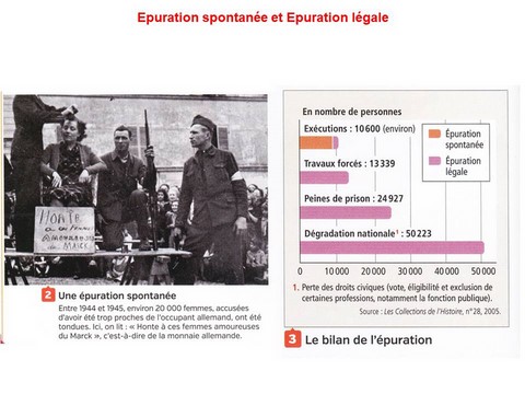 Epuration : volonté d’écarter les personnes accusées ou soupçonnées de collaboration avec l’Allemagne. L’épuration légale se fait par la voie légale (jugement) tandis que l’épuration spontanée est organisée par la population.