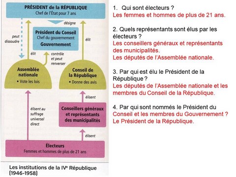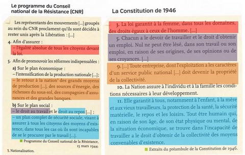 S’inspirant du programme du CNR, l’Assemblée adopte une nouvelle Constitution donnant naissance à la IVe République le 27 octobre 1946. Celle-ci établit une démocratie fondée sur la participation électorale du peuple mais aussi sur l’instauration de nombreux droits sociaux et de l’égalité homme-femme dans tous les domaines.