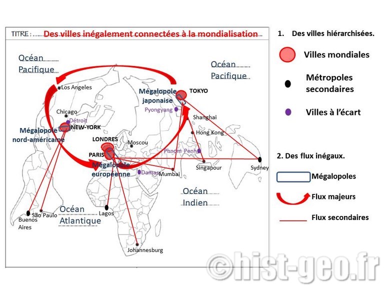 | Restituer des connaissances sur : - Londres : montrer qu’il s’agit d’une métropole mondiale bien intégrée à la mondialisation - Les grandes caractéristiques des villes mondiales et leur constitution en un archipel métropolitain. - Caractériser les villes restées à l’écart de la mondialisation (shrinking cities et autres villes (guerre, dictature et pays moins avancés). | Maîtriser le vocabulaire : Réseau, mondialisation, métropole, Commonwealth, Interface, Hub aérien, ZIP, archipel métropolitain mondiale, FTN, Technopôle, flux, mobilité, mégalopole, pays émergents, BRICS, Shrinking city, start-up, dictature et pays moins avancés. Maîtriser les repères géographiques : - Localiser Londres et Détroit sur des cartes à différentes échelles. - Localiser les plus grandes métropoles et les mieux connectées à la mondialisation. |