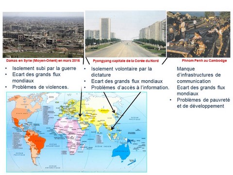 D’autres villes sont aussi à l’écart de la mondialisation car elles restent isolées des flux d’échanges et des réseaux de communication. Il s’agit soit de villes dont le pays est en guerre (Damas en Syrie) ou dirigée par une dictature (Pyongyang en Corée du nord) ; soit de villes situées dans les pays moins avancés comme Phnom Penh au Cambodge.