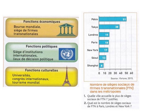Métropole : ville concentrant de nombreuses fonctions de commandement (économique, financière, politique, culturelle, etc.) qui la rendent attractive et lui permettent de rayonner sur le monde.