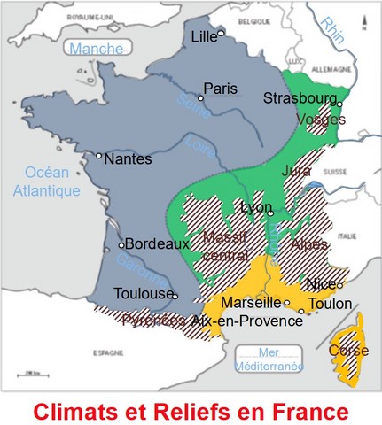 Le territoire français est un carrefour de l’Europe. Il constitue à la fois un isthme et un finisterre. Il appartient au milieu tempéré et possède tous les climats européens. Il se compose en large partie de plaines au nord, et d’anciens massifs montagneux au sud et au sud-est.