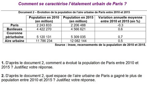 1. D'après le document 2, comment a évolué la population de Paris entre 2010 et 2015 ? Justifiez votre réponse.